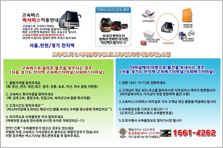 특징 고속버스나 KTX를 이용하여, 수도권과 지방을 연결하는 가장 저렴하고 빠른 당일 특급배송 서비스